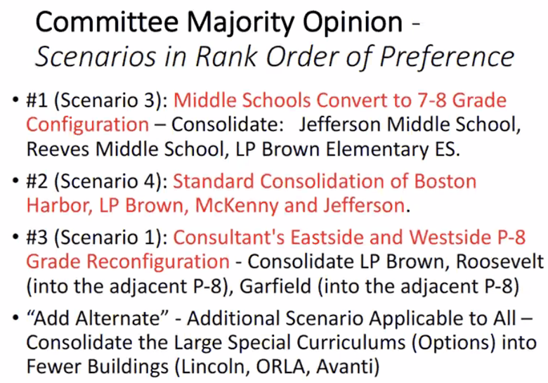 Two members of the committee spoke during the meeting, stressing that they did not offer up “recommendations” but rather a “Majority Opinion on Final Scenarios”. These were ranked in order of preference.