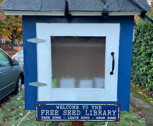 On the Frog Pond-side of Capitol Way is the Little Free Seed Library, a welcome stop for experienced or budding gardeners. I donated a bag of crocosmia seeds, tall stalks with bright red flowers – another hummingbird favorite.
