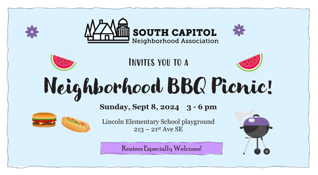 When you come to this second annual social/picnic at Lincoln Elmentary, please stop by the SCNA membership table and pick up a free raffle ticket and renew your membership or become a new member. It’s free to join. There will be a drawing at 4:30 pm. The lucky winner of the drawing will win a $100 gift certificate from Vic’s Pizzeria. We will be honoring two local businesses at our picnic: The Frog Pond and the Olympia Baking Company. We encourage you to support these two businesses.