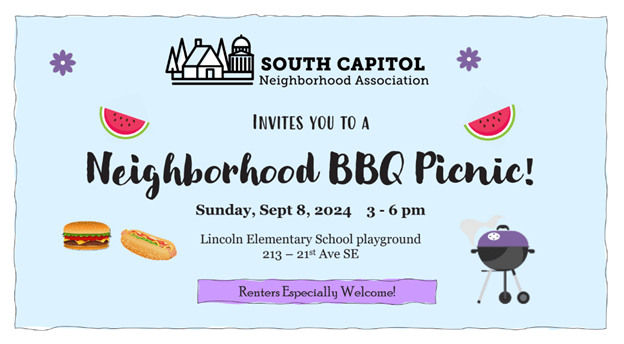 It is now August (already? whew! the summer seems to have flown by) and your invitation to the South Capitol Neighborhood Association’s BBQ/Potluck Picnic should be arriving in your mailbox soon. Please come! We’d love to have you join us! Here are the details:South Capitol Neighborhood BBQ/Potluck PicnicSunday, Sept 8th, 3 – 6 pmLincoln ElementaryContinue reading “Reminder – South Capitol BBQ/Potluck Picnic is Sept 8th!”