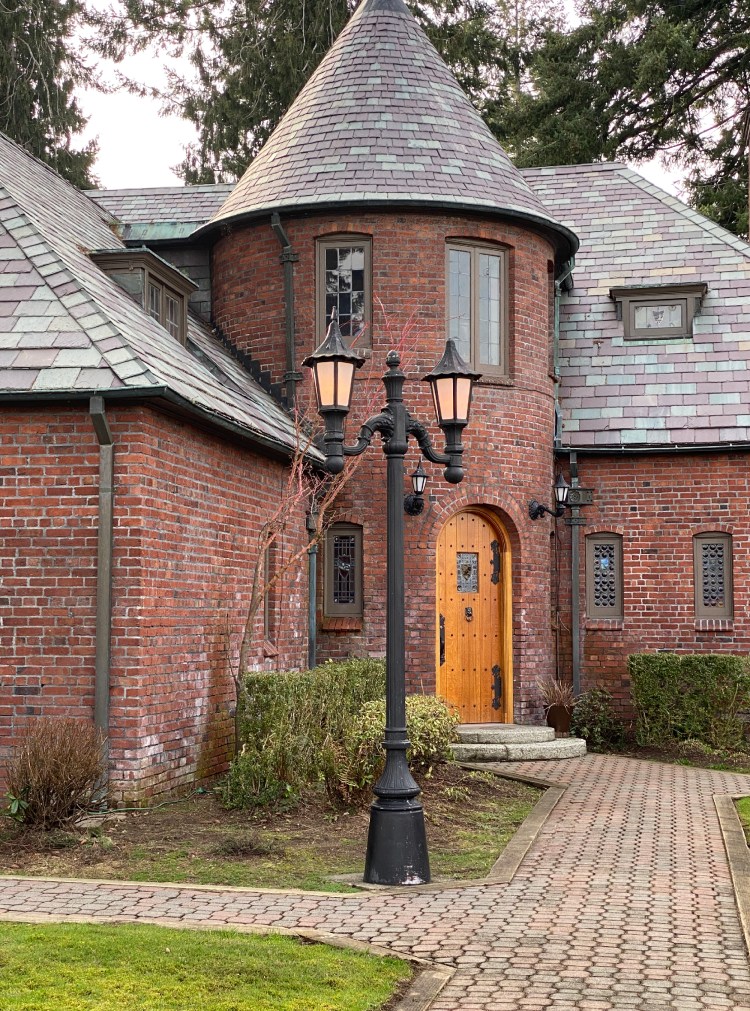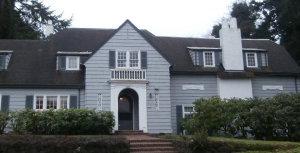 Judge Wright House – Built in 1923 for Judge D. F. Wright of Thurston County Superior Court, the house is a Joseph Wohleb design but is not typical of his other work in Olympia. This English Revival home is set in a corner lot surrounded by a high hedge and striking entry view. At the southwest corner is a porte cochere with tapered round columns and carved beam ends; it leads to a small porch sheltering the main entry door.