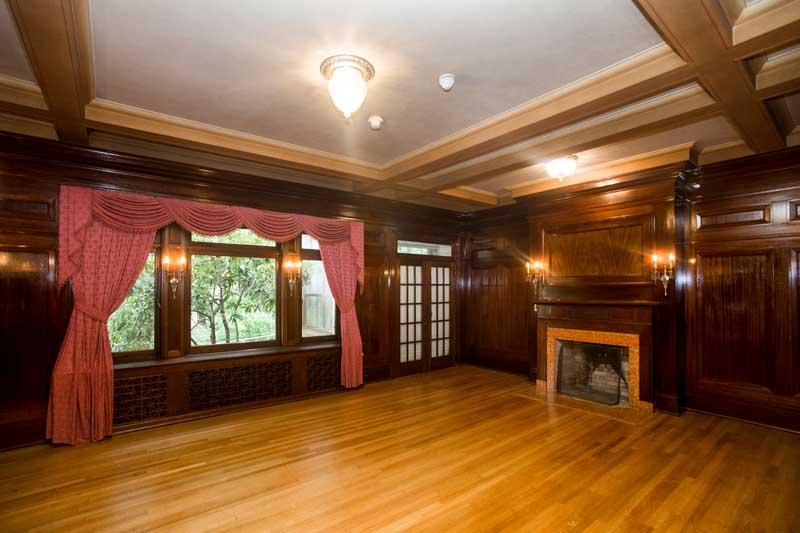 Fine interior details also demonstrate the quality of Wohleb’s design. A spacious central reception hall lined with recessed mahogany paneling dominates the first floor. Doors from the hall lead to the former living and dining rooms in the north portion of the house, and to a solarium and library in the south. The library housed McCleary’s gun collection and is said to have served him as a shooting gallery as well. Opposite the main entrance along the south wall, a graceful elliptical staircase winds to the second floor. At the landing, four arched, leaded glass windows create a gallery effect.