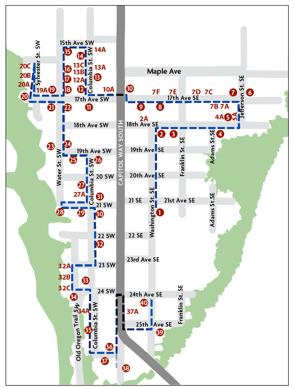 Walk south on Capitol Way, cross at 18th Ave crosswalk, then walk north toward 17th Ave SW. There are 2 optional stops on Capitol Way, then turn onto 17th Ave. SE.